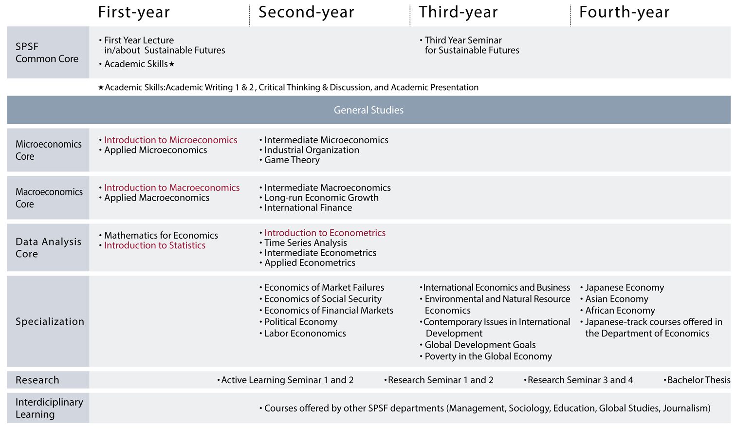 6. Based on the fundamental knowledge required in the common goals described in the Diploma Policy and in order to support students to acquire expertise while exploring their own individual qualities and interests, students are able to select various Specialized Courses, including courses offered by other departments and faculties, in addition to advanced economics courses.In addition to the above, the SPSF course constructs its curriculum in the following manner, for the purpose of achieving the common diploma policy across the six departments: