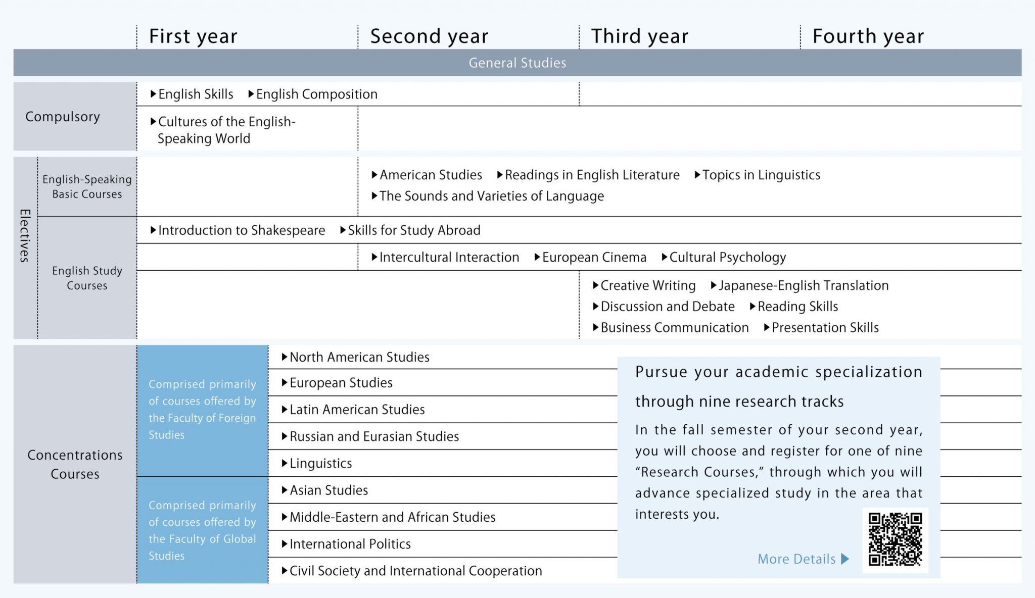 In the Second Major or Minor, students choose one of nine research courses for specialized study and research. Many students gain overseas experience through short-term study-abroad programs or exchange programs, and by utilizing the credit system, it is possible for students to graduate in four years even if they study abroad for one year.