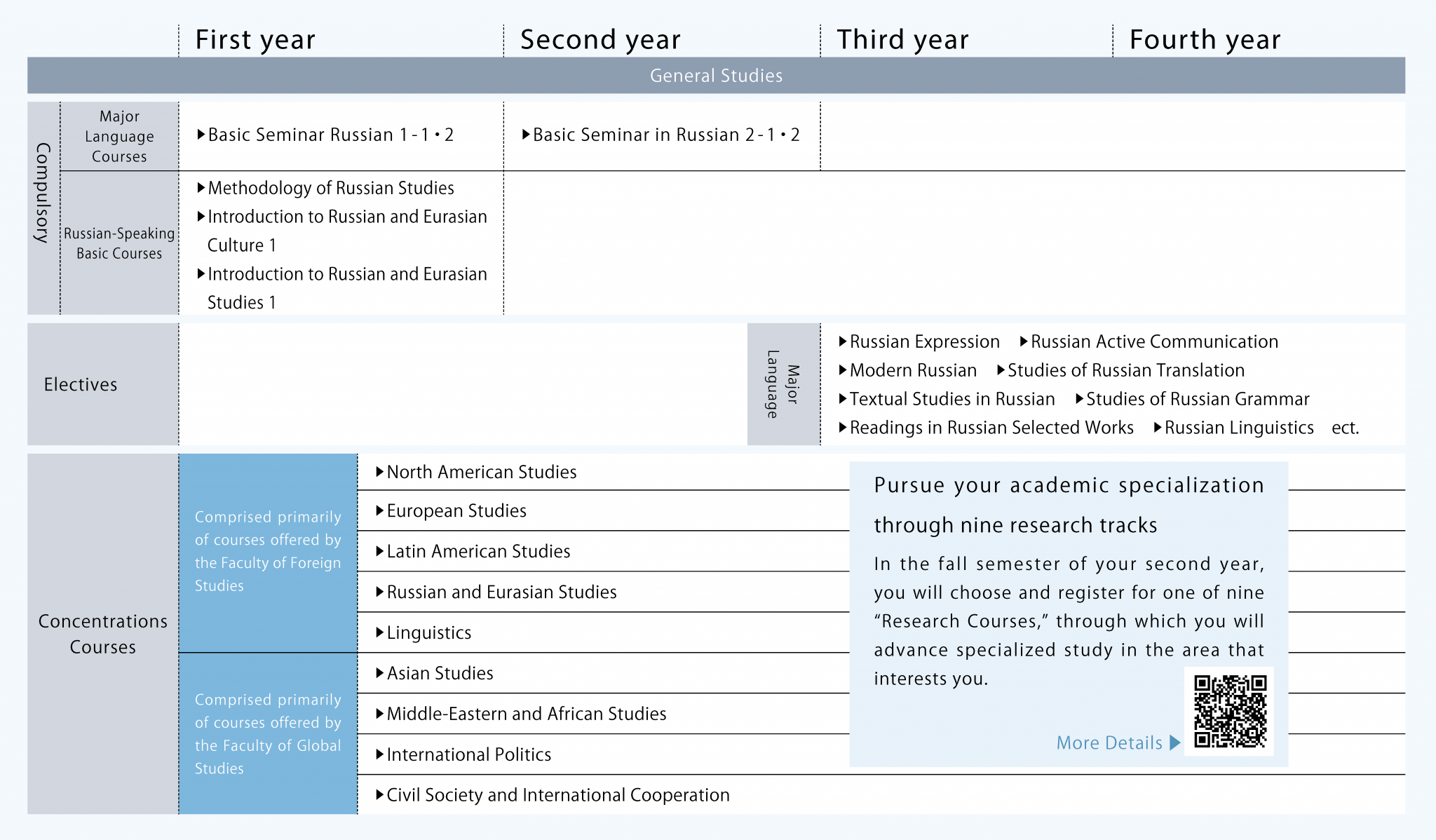 Students learn the basics of the Russian language in detail during their first and second years of study. The Basic Seminar Russian course consists of six lessons, 600 minutes per week, with first-year students taking Comprehensive, Conversation, and Grammar classes, and second-year students taking Drill, Conversation, and Reading classes, all of which are taught by native Russian speakers. In the third and fourth years, students study intermediate to advanced Russian language courses to acquire advanced communication skills. In the first year, students take courses such as Basic Russian Language Courses, which aim at understanding Russian ideas as well as the politics, economy, culture, and art of Russia and Eurasia, leading to specialized studies in one of nine research courses.