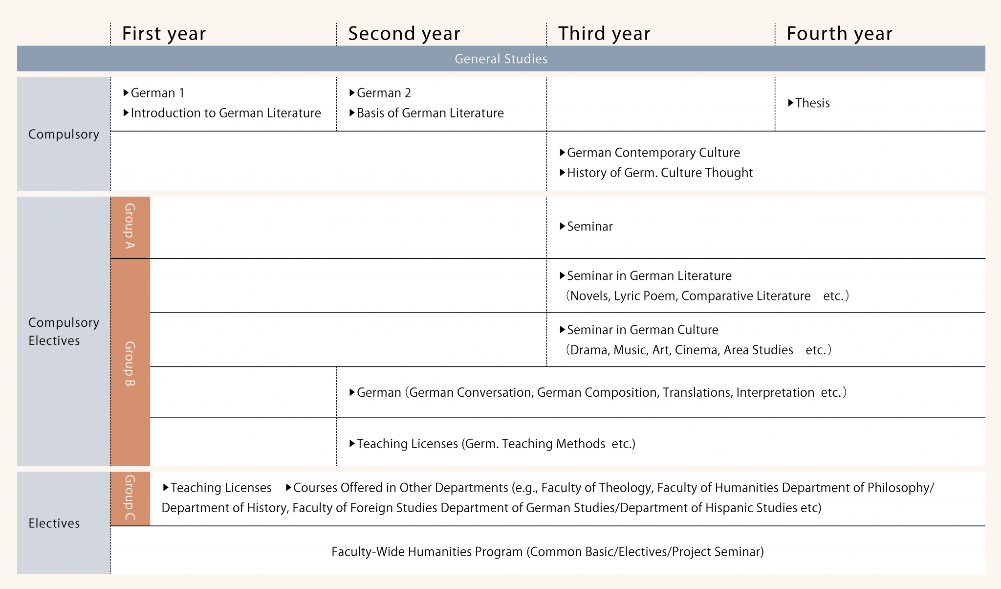 In accordance with the Diploma Policy, with an aim to develop and promote the qualities and abilities that will contribute to mutual exchange among different cultures, and with a focus of acquiring German and conducting research on the culture of the German-speaking world, the Department of German Literature constructs its curriculum as follows: