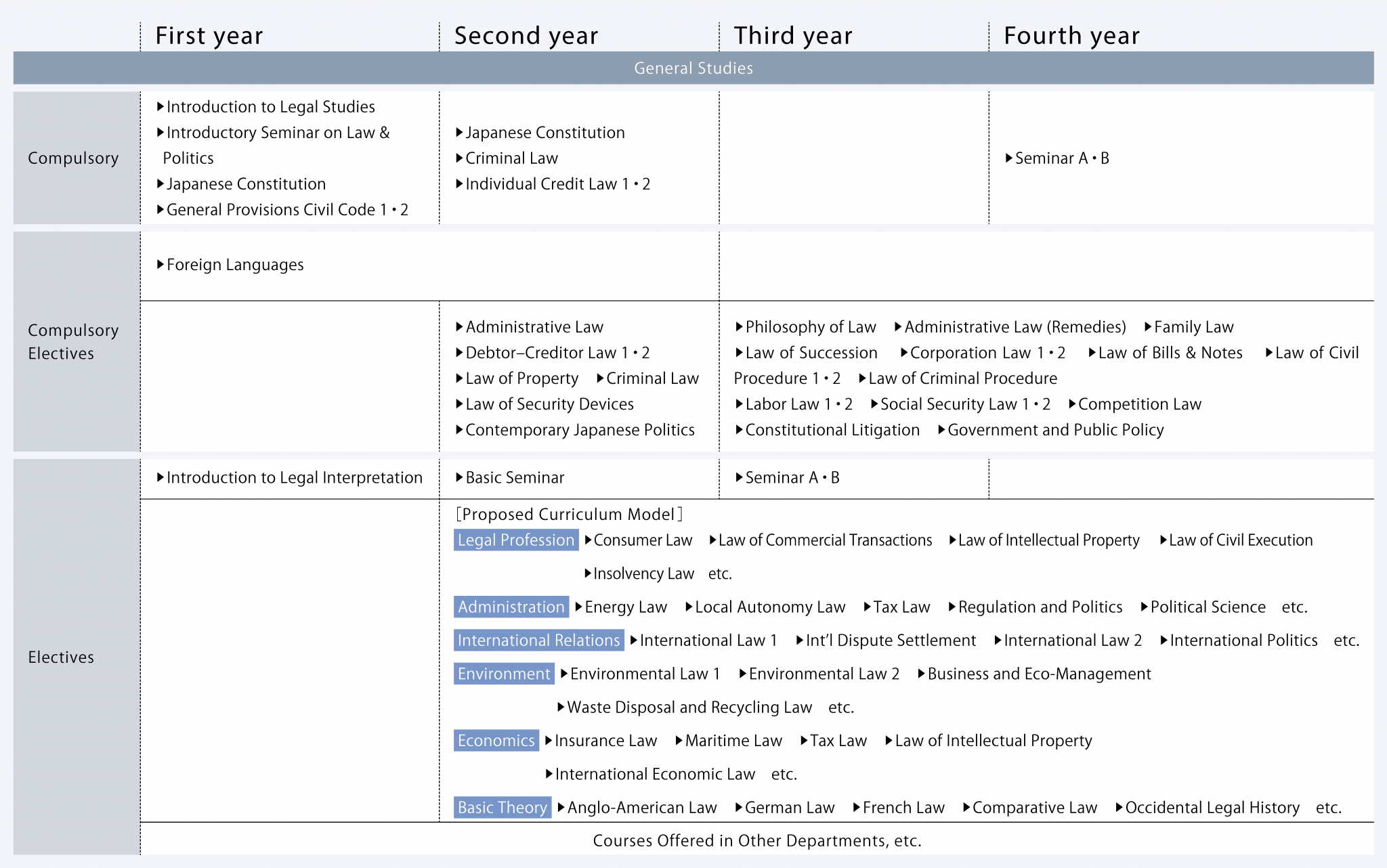 - Lectures on Japanese Constitutional Law, Civil Law, Criminal Law, and other substantive law (basic legal subjects/compulsory courses), to install a legal framework in a thought process and to develop the ability to examine social issues using this framework, which form the foundation of jurisprudence.