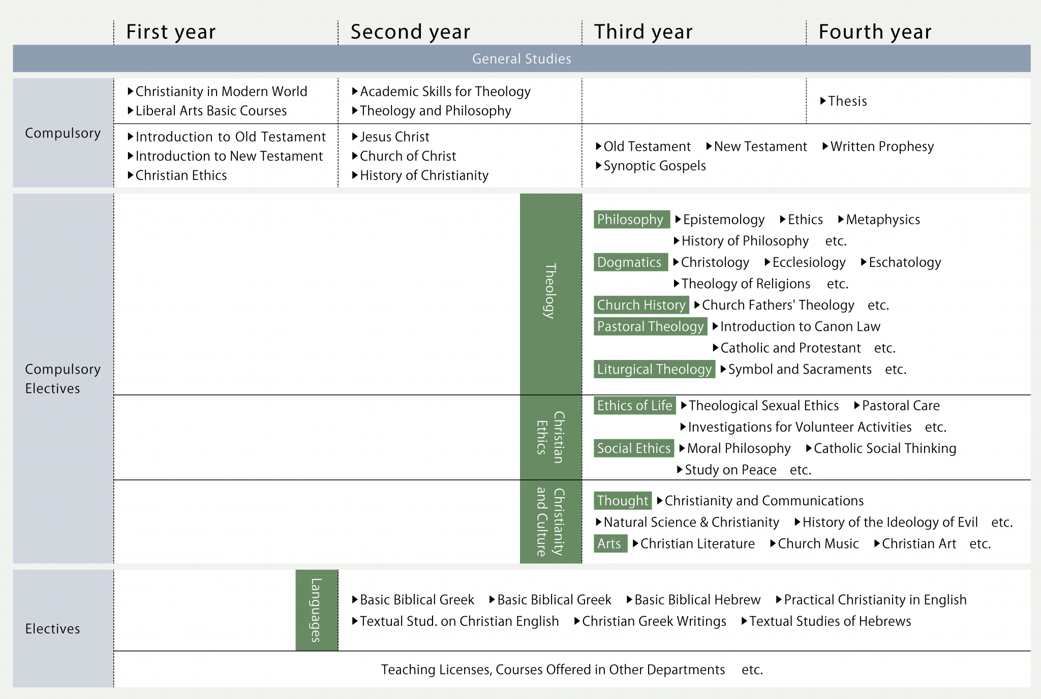 During the first and second years, students focus on subjects related to the Old and New Testaments, the basics of Christian doctrine, the relation between Christianity and philosophy, and the history of Christianity to gain a basic understanding of Christianity. From the third year, students focus on further advanced and specialized studies building on the basis developed in the first two years. Specialized studies are divided into three fields: “Theology” for doctrinal studies and church history, “Christian Ethics” for bioethics and social ethics, and “Christian Culture” for Christian ideology and art. Finally in the fourth year, students write a graduation thesis on the results of their research, under a theme of their own choice based on their studies conducted in the three years prior.