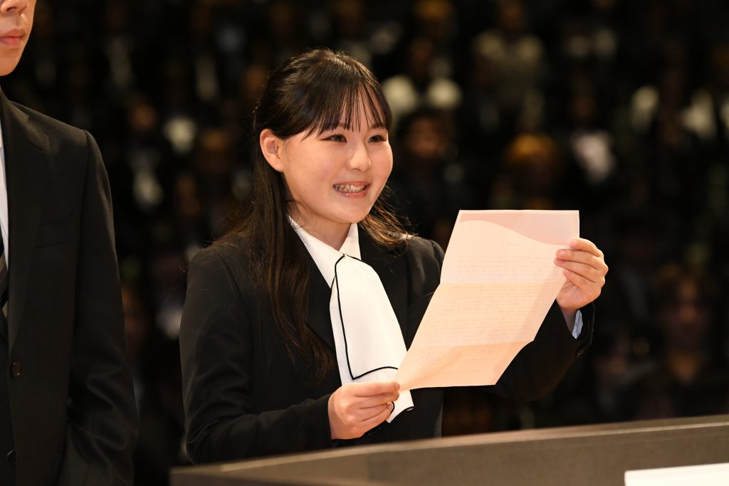 In the student address, Mina Ishiwatari (Graduate School of Global Environmental Studies, morning session) stated her aspirations, saying, “Under Sophia University’s educational spirit of ‘For Others, With Others,’ I will engage sincerely with my research theme and pursue my academic path together with fellow students who have gathered here from around the world.”