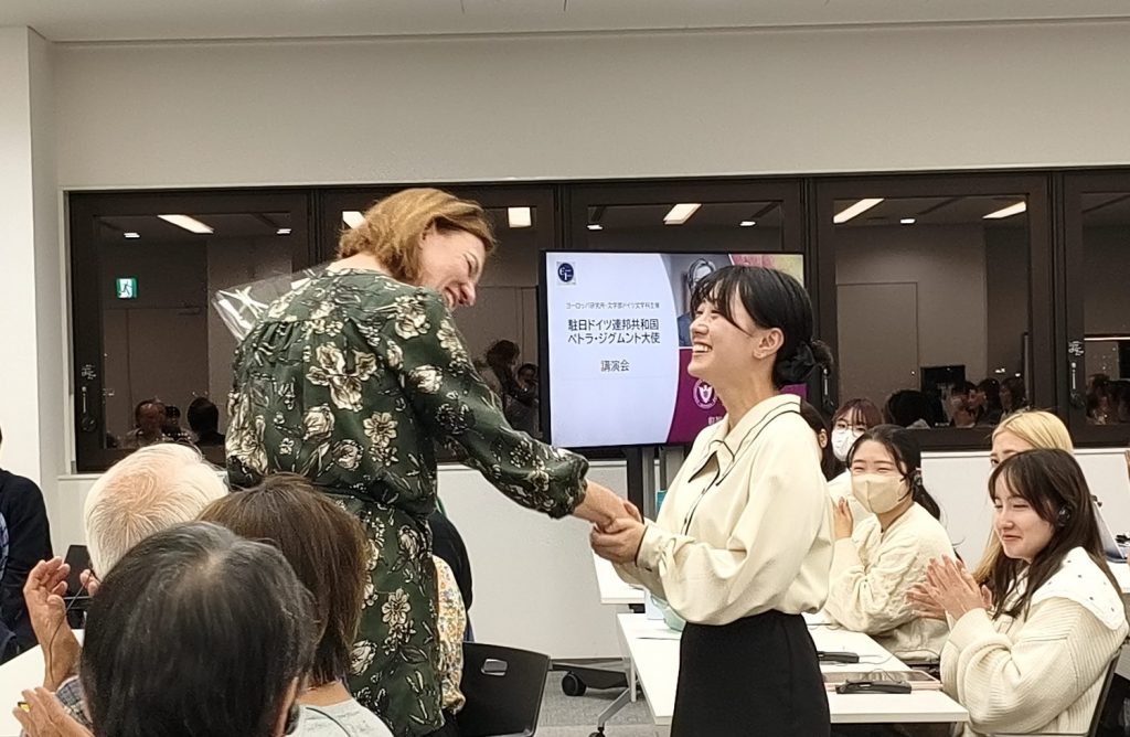 On October 28, German Ambassador to Japan, H.E. Petra Sigmund, visited Sophia University’s Yotsuya Campus to deliver a lecture titled “Von China nach Japan” (From China to Japan). The event drew over 100 students and faculty members, who listened attentively throughout the session. The lecture was hosted by the European Institute of Sophia University and the Department of German Literature, with Professor Emerita Dr. Mechthild Duppel serving as moderator.