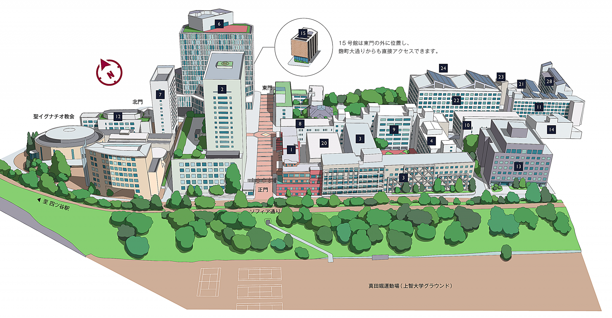 教室/ COM教室/テレビセンター/入学センター/学事センター/基盤教育センター/教職・学芸員課程センター/学生センター/キャリアセンター/情報システム室/グローバル教育センター/カトリック・イエズス会センター/総合人間科学部・法学部・経済学部・外国語学部・総合グローバル学部研究室/学生食堂/ラウンジ「サブウェイ」/紀伊國屋書店/パティネ・スポーツ