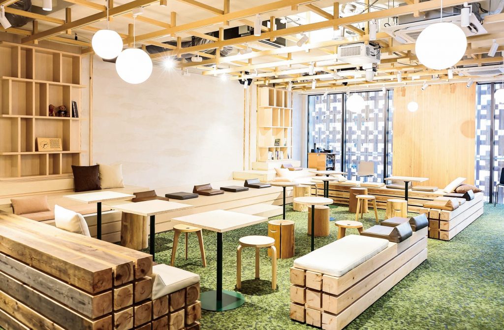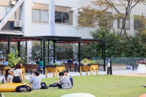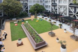 屋上庭園は緑に覆われたパーゴラエリア、芝生が広がるエリア、デッキエリアで構成されています。学生たちが授業の合間にひといき休憩ができるとともに、交流が育めるような広場です。