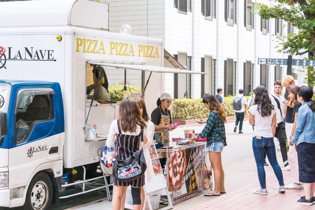 学内数か所に、日替わりでキッチンカーが出店します。タコライス、タイ料理、カレー、グリルチキン、ローストビーフ丼など豊富なメニューが学生たちのお腹を満たします。