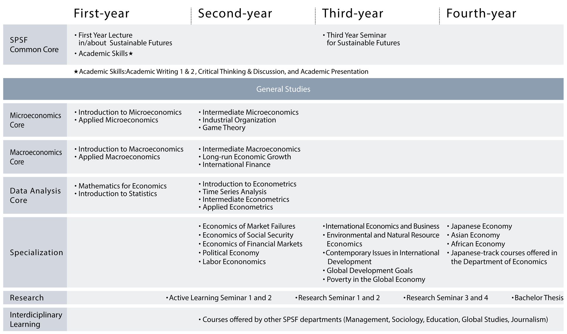 - ディプロマ・ポリシーで目標としている共通の基礎的な知識と能力を基盤として、さらにそれぞれの学生が自らの特性や興味にあった専門性を獲得することを支援するために、より専門性の高い経済学の科目に加え、経営学や他学部他学科科目を含む多様な専門科目を選択できるようにする。