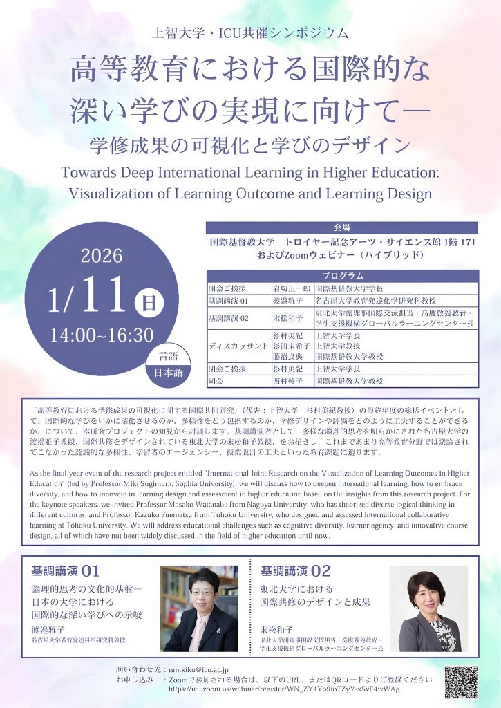 「高等教育における学修成果の可視化に関する国際共同研究」(代表:上智大学 杉村美紀教授)の最終年度の総括イベントとして、国際的な学びをいかに深化させるのか、多様性をどう包摂するのか、学修デザインや評価をどのように工夫することができるか、について、本研究プロジェクトの知見から討議します。基調講演者として、多様な論理的思考を明らかにされた名古屋大学の渡邉雅子教授、国際共修をデザインされている東北大学の末松和子教授、をお招きし、これまであまり高等教育分野では議論されてこなかった認識的な多様性、学習者のエージェンシー、授業設計の工夫といった教育課題に迫ります。