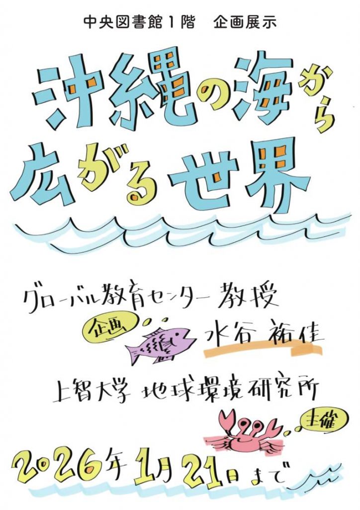 2026年1月7日から21日まで、上智大学四谷キャンパス中央図書館1階にて、沖縄の海の環境や、海に関連する文化に関する小さな企画展示「沖縄の海から広がる世界」を地球環境研究所主催で開催中です。入場無料、申込不要ですので、ぜひお立ち寄りください!