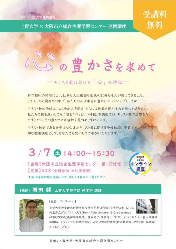 上智大学大阪サテライトキャンパスと大阪市立生涯学習センターが共催し、市民の皆さまへ広く開く連携講座を開講いたします。本講座は、キリスト教に関する予備知識がなくてもご参加いただける、どなたにも開かれた教養講座です。地域のみなさまに学びの機会を届ける大学連携講座として、無料で開催いたします。