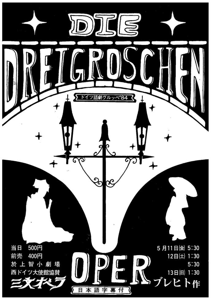 ドイツの最も偉大な劇作家ブレヒトを始めとして、ゲーテ、クライスト、ホフマンスタール、レッシングなど著名な作家の作品を上演したばかりでなく、伝統的な演劇の枠組みに挑戦したペータ=ハントケの『カスパー』なども取り上げました。1987年に上演したヘルマン・シュルツ作『ここにも風は戻って』いう作品では、幻想的な舞台づくりに加え、日本語を交えて演じるなどの試みを行い、学内外からさまざまな反応がありました。