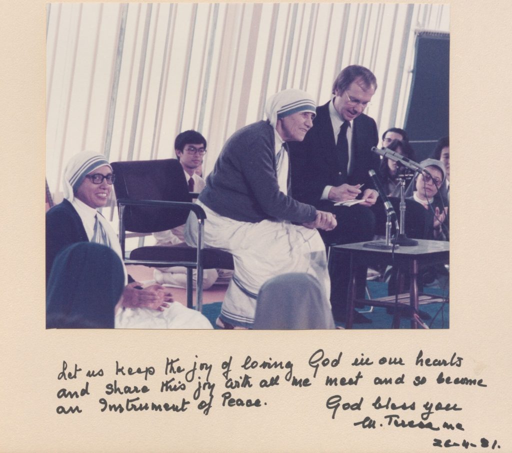 マザー・テレサは生涯で三度来日し、そのたびに本学で講演を行いました。最初の1981 年には「ビューティフルなことって何」と題した講演があり、約1,300人の学生・教職員に深い感動を残しました。続く1982年には「飢えることとは?」、1984年には「飢えと生命」をテーマに話し、豊かな日本に潜む心の飢えを鋭く指摘しました。