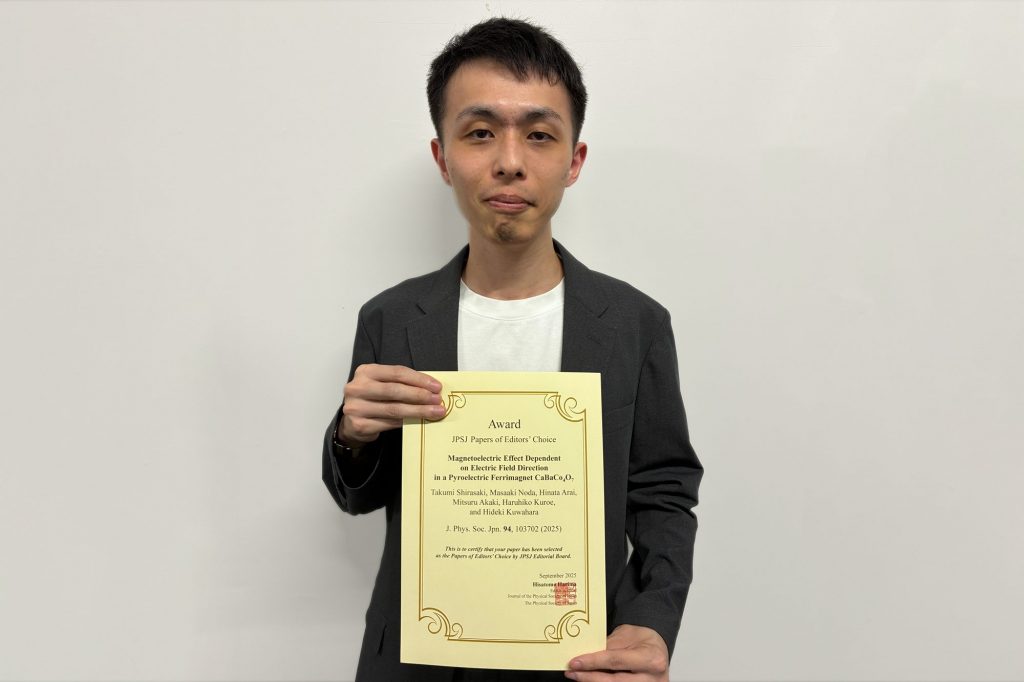 白崎さんは今回の受賞に際して「この度は、JPSJ注目論文に選出いただき、大変光栄に思います。私たちの研究成果がこのような形で評価されたことを、心から嬉しく感じています。指導教員の先生をはじめ、共同研究者の皆様、そして日頃から支えてくれる研究室の仲間に深く感謝いたします。今回の受賞を励みとし、今後も研究に真摯に取り組んでいきたいです。」と語っています。