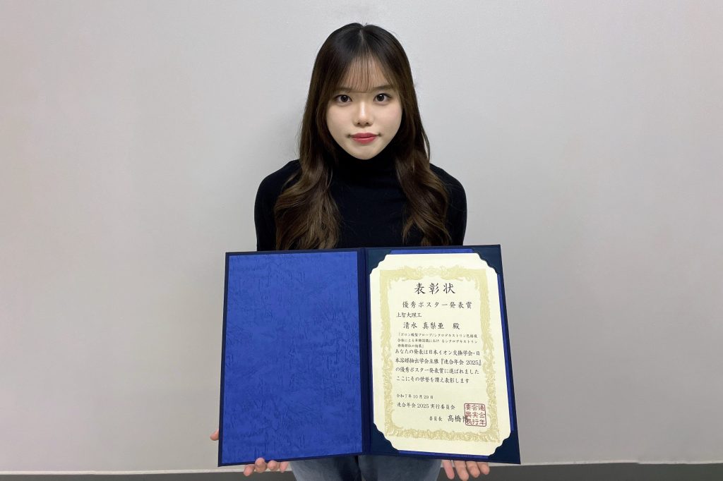 清水さんは今回の受賞に際して「この度は優秀ポスター発表賞を頂き、大変光栄に存じます。多くの先生方や企業研究者の皆様に足を止めていただき、活発な意見交換を通じて自身の研究の可能性と課題を再認識いたしました。積極的に対話を重ねた時間は大きな刺激となり、学びの多い貴重な経験になりました。本受賞を励みに今後も研究に真摯に取り組んでまいります。ご指導くださった先生方、研究室の学生の皆様に心より感謝申し上げます。」と語っています。