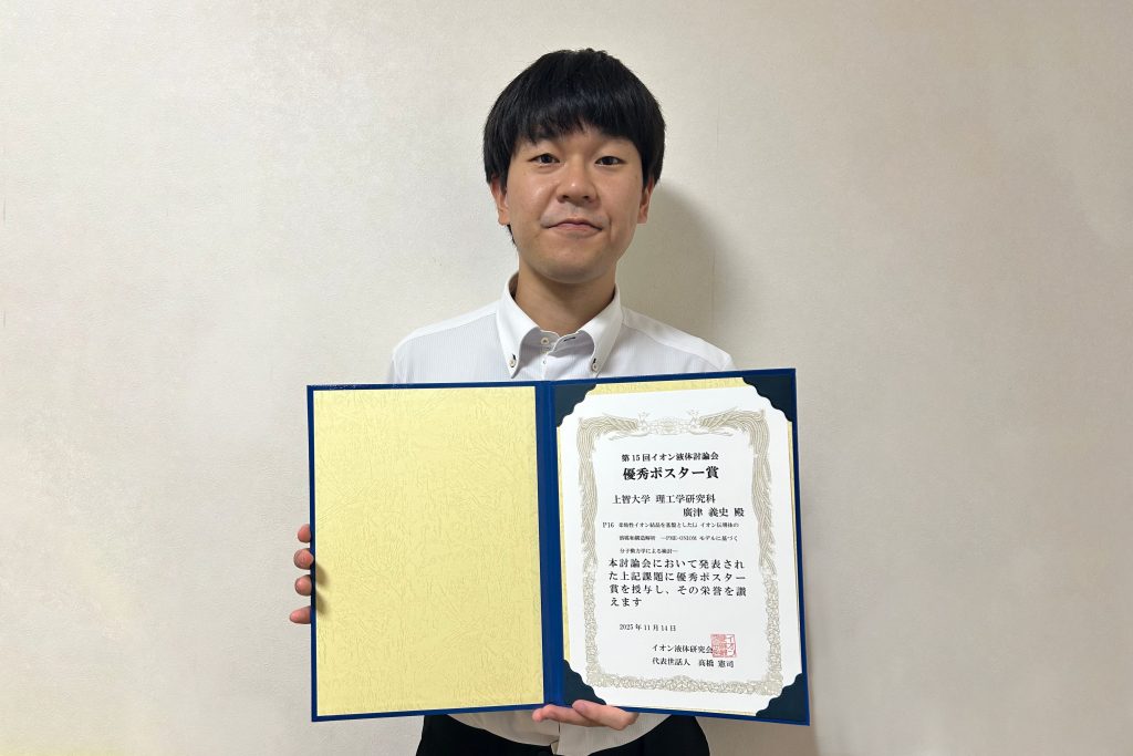 理工学研究科理工学専攻応用化学領域 博士後期課程1年の廣津義史さんが第15回イオン液体討論会で優秀学生ポスター賞を受賞しました。
