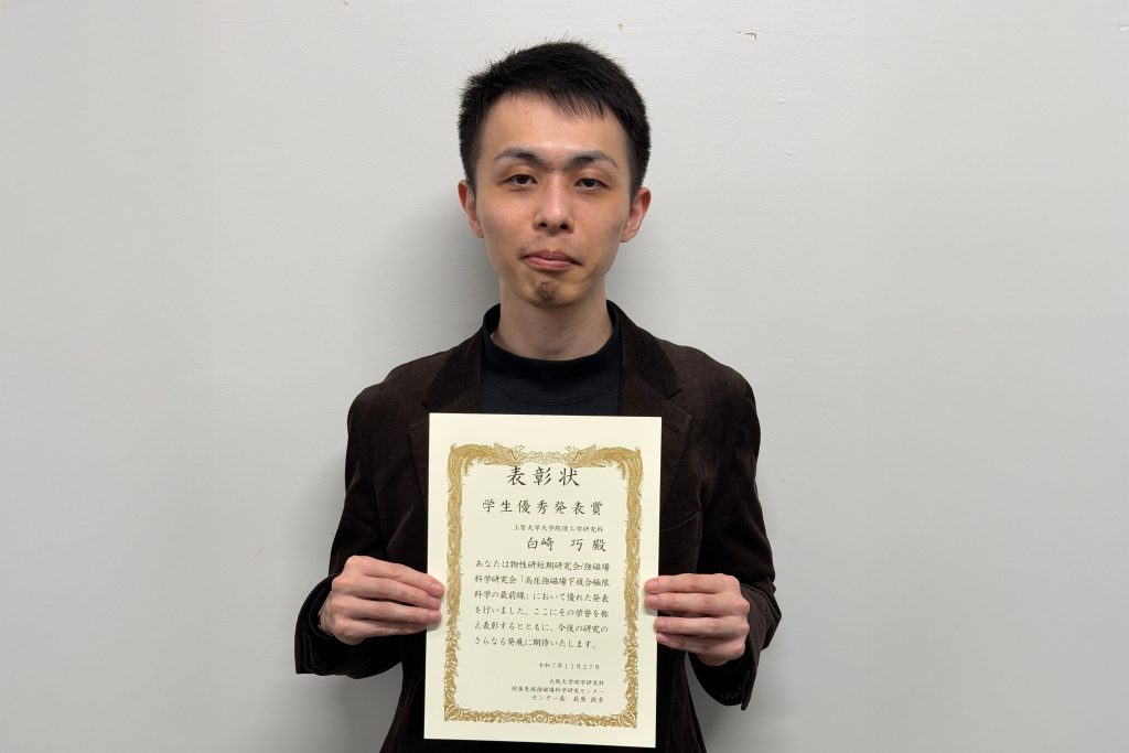 理工学研究科理工学専攻物理学領域博士後期課程1年の白崎 巧さんが強磁場科学研究会2025で学生優秀発表賞を受賞しました。