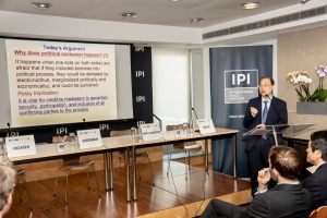 続いて、One Earth Future 財団の平和部門のディレクターである、Conor Seyle 博士が、昨年編著し出版した包摂性と平和構築に関する本での議論を紹介し、東教授の発表内容と重なるところが多いと強調しました。また、スリランカの研究者で、IPIからスリランカの平和構築に関するペーパーを出すことになっているHasini Haputhanthri氏が、スリランカの文脈で、平和構築における包摂的なプロセスを作る難しさについて、自らの体験も交えて語りました。