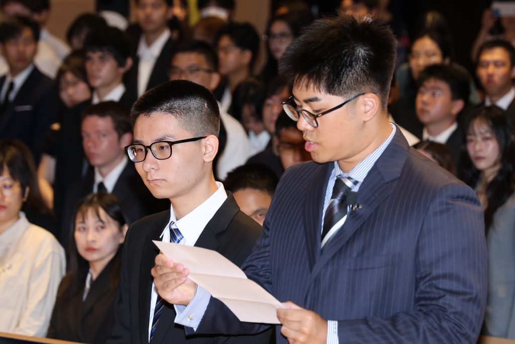 杉村美紀学長の式辞に続いて、新入生代表のオクタロウ・オウさん(理工学部物質生命理工学科)が登壇し入学の言葉を述べました。