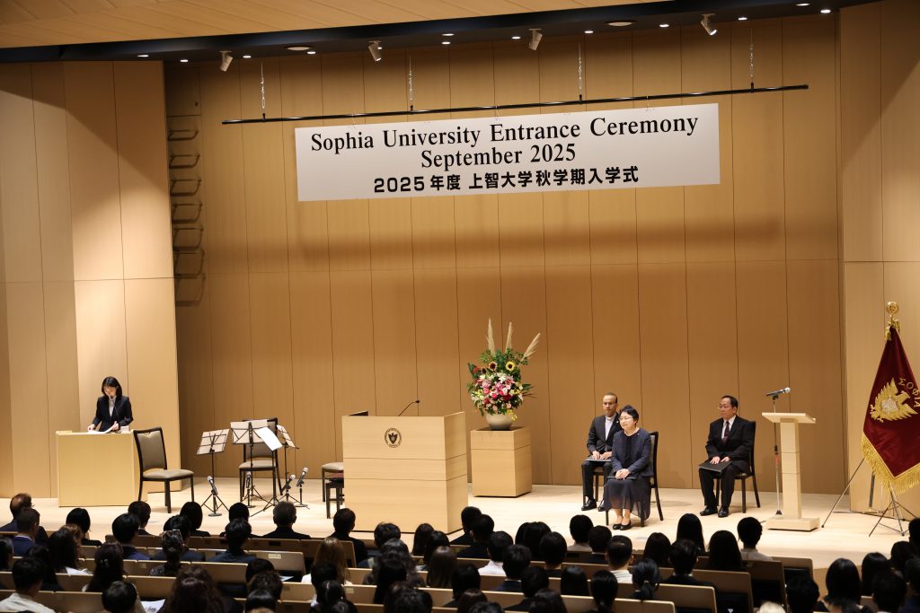 サリ・アガスティン理事長は祝辞で、今年が広島・長崎への原爆投下と第二次世界大戦終結から80年という節目であるともに、カトリック教会の「聖年」であることに触れ、「戦争の記憶が薄れつつある今、私たちは過去の悲劇に真摯に向き合い、平和の責任を担うべきです。上智大学は『他者のために、他者とともに』の教育精神のもと、軍事目的の研究を行わず、希望と和解の光となることを目指しています。どうか多様な仲間と対話し、より公正で平和な世界の実現に向け、自らの役割を考えてください」と述べました。