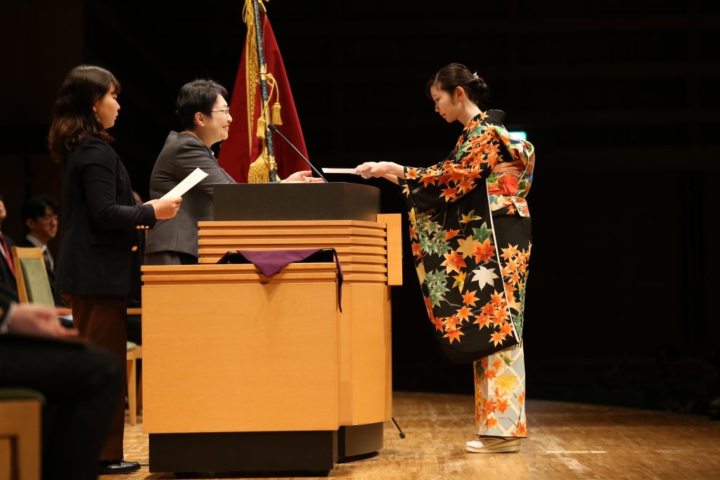 式は上智大学管弦楽団の奏楽に始まり、カトリック・イエズス会センターによる祝福の後、杉村美紀学長による式辞、学位記・修了証書の授与が行われました。続いて、サリ・アガスティン上智学院理事長および上智大学ソフィア会会長の鳥居正男氏による祝辞が述べられ、卒業生・修了生代表(午前の部は外国語学部イスパニア語学科の小俣逸花さん、午後の部では経済学研究科経済学専攻の細野美晴さん)による謝辞がありました。