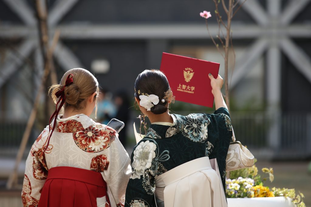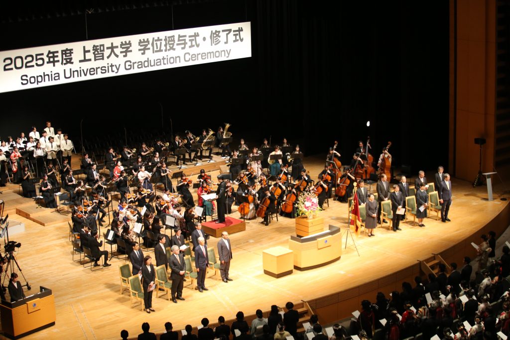 杉村学長は式辞の結びで、「皆さんがこれからそれぞれの進む道で活躍される際に、上智大学で培ってきた学びや経験が、きっと皆さんを支え続けることと思います。ぜひご自身の持つ実力を信じ、夢と勇気をもって道を選択するとともに、他者と向き合い、寄り添う姿勢も大切にして進んでいってください」と卒業生・修了生を激励しました。