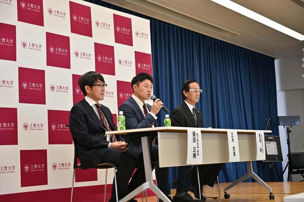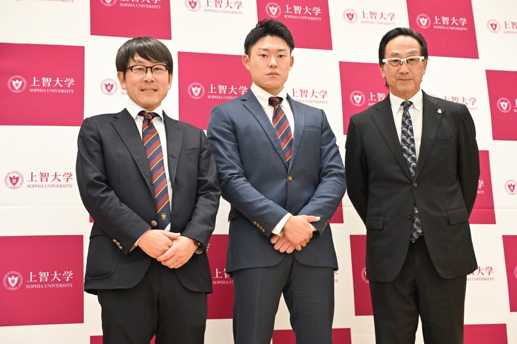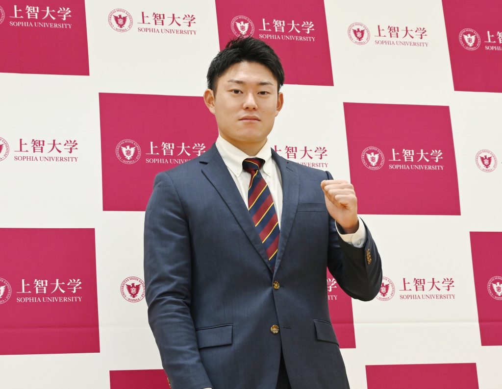 スポーツ推薦制度を持たない本学において、在学生がドラフト会議で指名を受けるのは、上智大学の歴史の中でも初めてのことです。翌24日には四谷キャンパスで記者会見に臨み、指名を受けての心境や今後への意気込みを語りました。