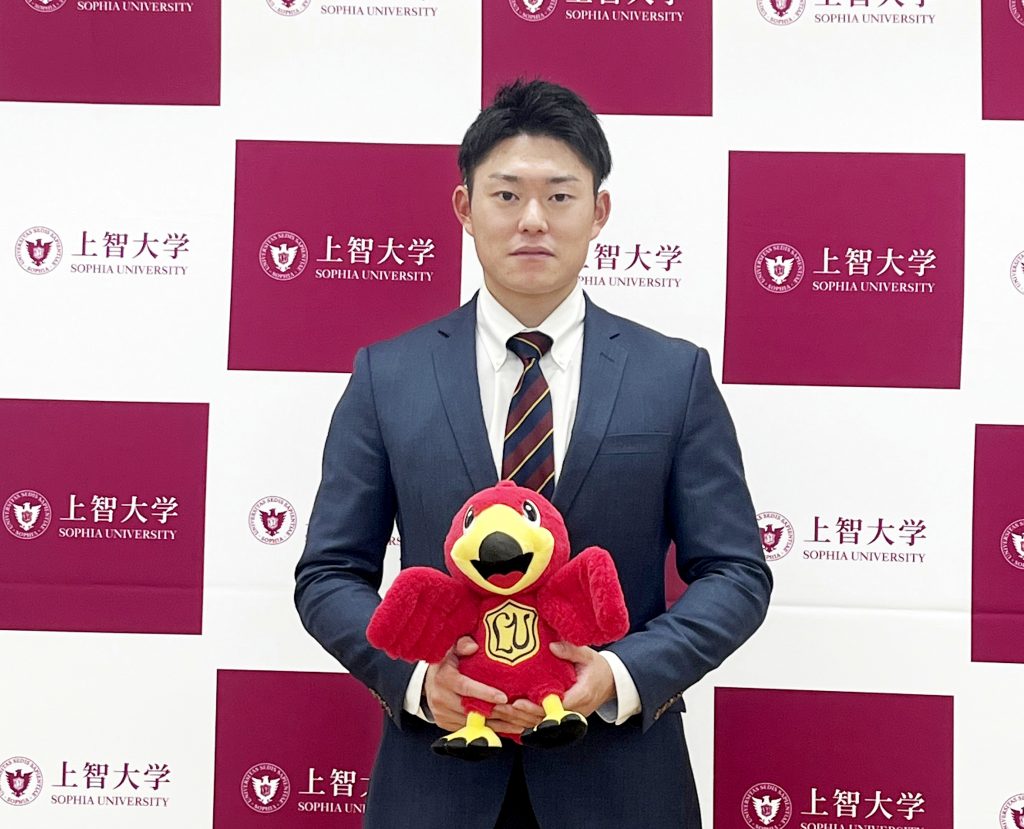 スポーツ推薦制度を持たない本学において、在学生がドラフト会議で指名を受けるのは、上智大学の歴史の中でも初めてのことです。翌24日には四谷キャンパスで記者会見に臨み、指名を受けての心境や今後への意気込みを語りました。