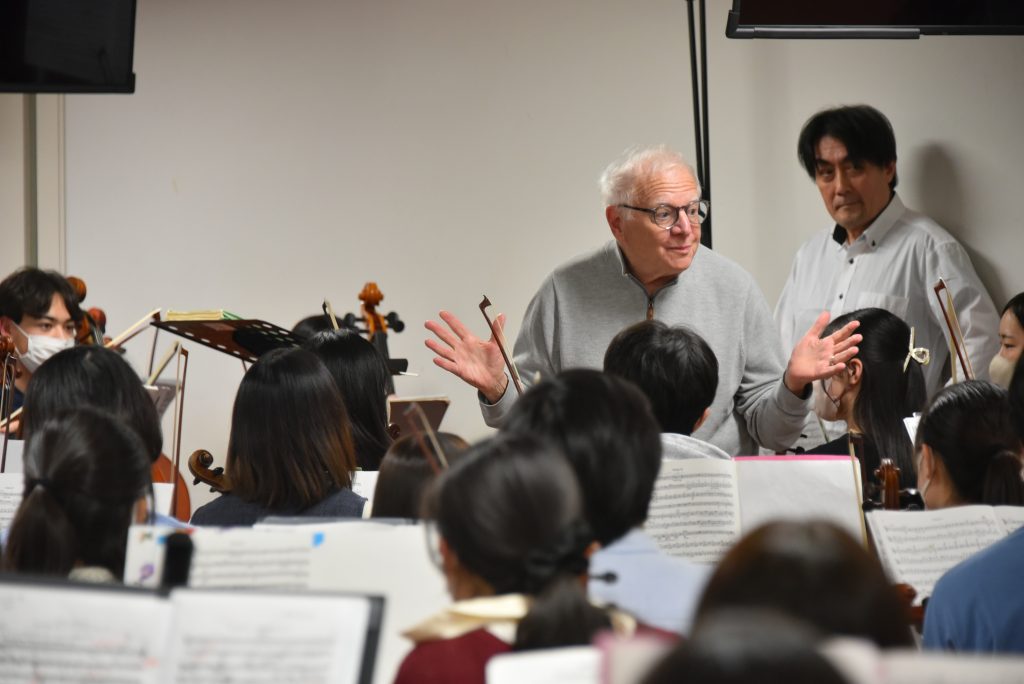 この機会は、同部の指揮者・金山隆夫氏がかつてセントルイス交響楽団でスラットキン氏の指導を受け、その後も親交を深めてきた長年の絆によって実現したもので、スラットキン氏が本学を訪れるのは3年ぶり。