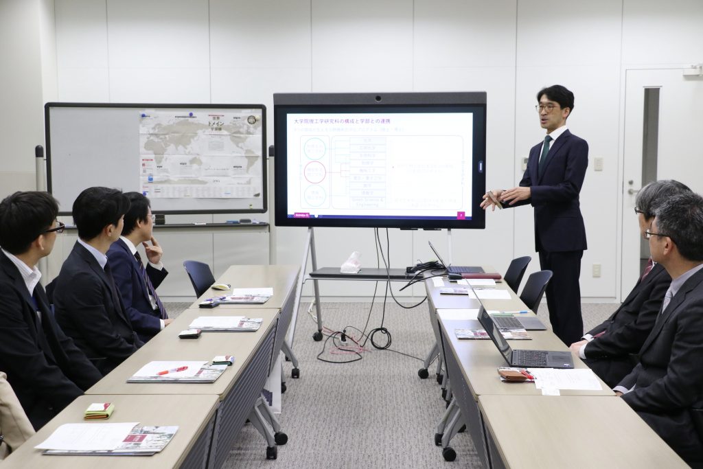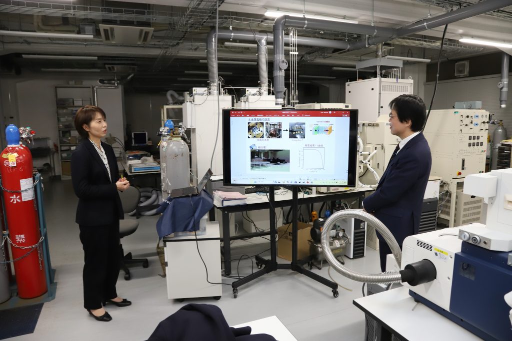 視察では、理工学部のマテリアル拠点を訪れ、竹岡裕子教授から次世代エネルギーにつながる最先端研究を紹介しました。また、澁谷智治理工学部長から理工学部の研究・教育の取り組みや、2027年度4月設置構想中の「デジタルグリーンテクノロジー学科(DG Tech)」の概要について説明しました。