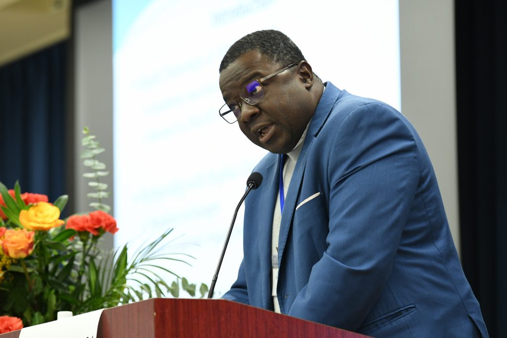 飯島真里子グローバル化推進担当副学長からの事業概要説明を挟んで、アフリカ側からの基調講演として、2018年度より本学学生派遣の実績があるアビジャン・イエズス大学(コートジボワール)のArcène Brice Bado学長より、本事業による日本とアフリカのこれからの協働の可能性についてお話いただきました。