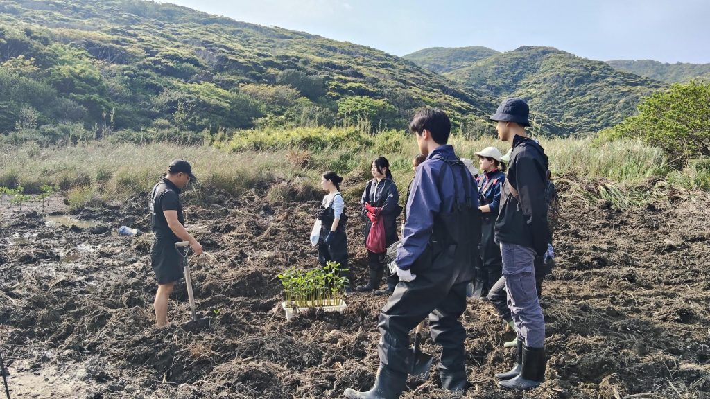 今年は15名の在学生が参加し、事前学習と現地での体験により、環境保全や地域活性化、世界自然遺産をめぐる現状への理解を深めました。参加者は枝手久島でのマングローブ植林作業(苗木は伊藤忠商事より提供)や、天然記念物クロウサギのナイトモニターツアーを体験。また、島唄などの伝統文化体験や地域住民の方との交流会を都通じて、宇検村地域の伝統や文化、地域活性化など、様々な社会課題について学びました。