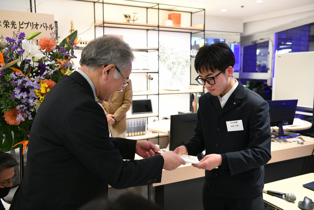 各校から3名ずつ、計6名が登壇し、それぞれが選んだ一冊の魅力を紹介しました。観覧者による投票の結果、「最も読みたくなった本」に贈られるチャンプ本(優勝)には、岩崎千祥さん(栄光学園中学校3年・当時)が発表した『ベルリンは晴れているか(深緑 野分【著】・筑摩書房)』が選ばれました。岩崎さんは「皆さんがこの本を読んでくれたら本当に嬉しいです。自分なりの解釈を考えながら読むと、より面白く感じられると思います」と語りました。