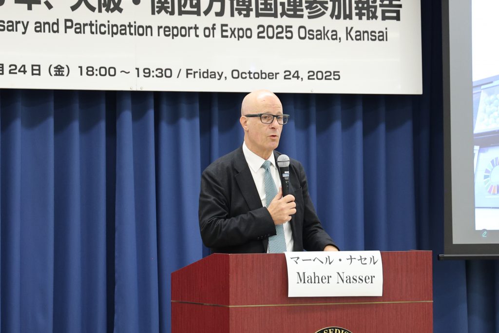 続いてナセル氏が基調講演を行い、80年間の国連の歩みとその取り組みによる人々への影響を述べたうえで、いかに多国間主義を目指す上で国連が中心的役割を果たしたかを解説。また、UNパビリオンについて、ZONEごとに展示した意図や目的を紹介し、来場者の属性や反響に関する調査結果を公表しました。「国・地域別の人口の変化を見ると、今後新しい現実に向かうことは不可避で、多くの課題と機会が生まれるでしょう。今ほど世界で共存の必要性が強まった時代はありません。多国間主義は様々な課題に取り組む唯一の手段です」と語り、今後も国連が掲げる運営原則を軸に改革を進める意欲を示しました。
