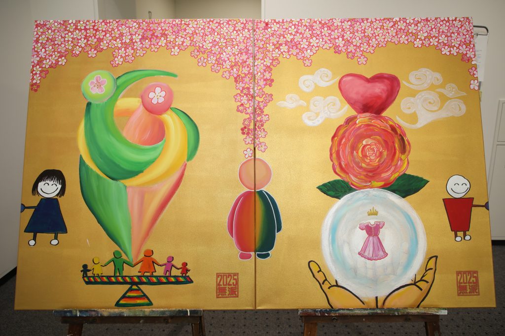 最後にパネルディスカッションを実施し、「創造性の意義や育み方」「現場で役立った事例」などをテーマに実践で役立つ議論が交わされました。会場からは多角的な質問が寄せられ、小松教授が「遊びやアートは生み出す喜びを体験させ、創造性を発揮することは、未来は変えられるという希望につながる。特に、異文化接触を伴う協働学習は創造性を高め、社会や世界とつながる感覚を持てる点において重要」と総括し、盛況のうちに閉会しました。なお、会場外では、ムハ氏が上智生と共同制作した絵画が展示されました。