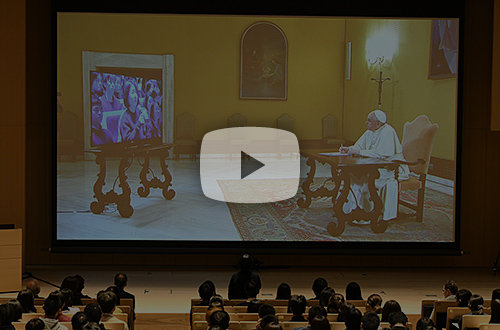 From the sound data we can recognize the joy of the audience at the Pope’s speech, filled with humor. He used the word “Sophia” repeatedly in his address, indicating his high expectations for our university. The full text of the address is featured in our university newspaper, Jōchi Daigaku Tsūshin.