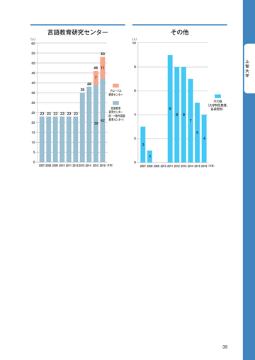 専任職員数(局長、グループ・センター長、主幹、チームリーダー、係員)は、ここ 10 年間、250 人前後で推移している。2011 年度の増加は聖母学園との合併によるものである。また、2014 年度の学 事局関連の増加は、事務組織の改変により、学事局にグローバル教育推進室、言語教育推進室が新たに 設置されたためである。 職位別に見ると、業務分野の多様化により、非常勤嘱託職員数がこの 10 年間で約 60 人増加している。
